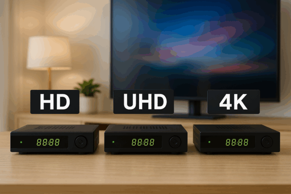Welches Modell passt wirklich zu Ihnen? Produktvergleich: 3 Receiver nebeneinander, sauber dargestellt, mit klaren Labels (HD, UHD, 4K) und moderne TV-Atmosphäre