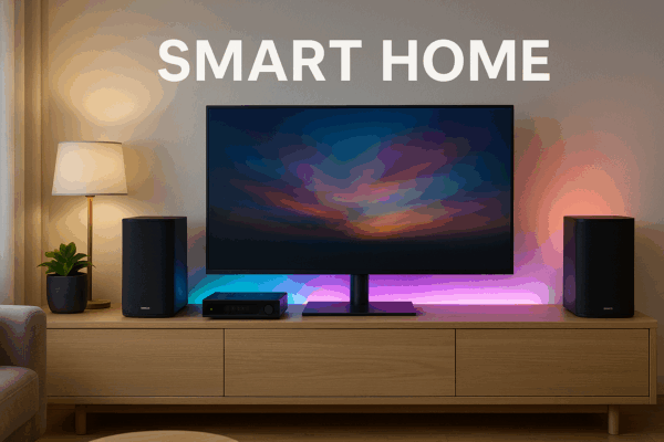 So machen Sie Ihr Zuhause smart – SAT & HiFi clever integriert“ Smart Home Wohnzimmer: TV, Lautsprecher, Receiver, LED-Lichtsteuerung alles in einem eleganten, modernen Setting